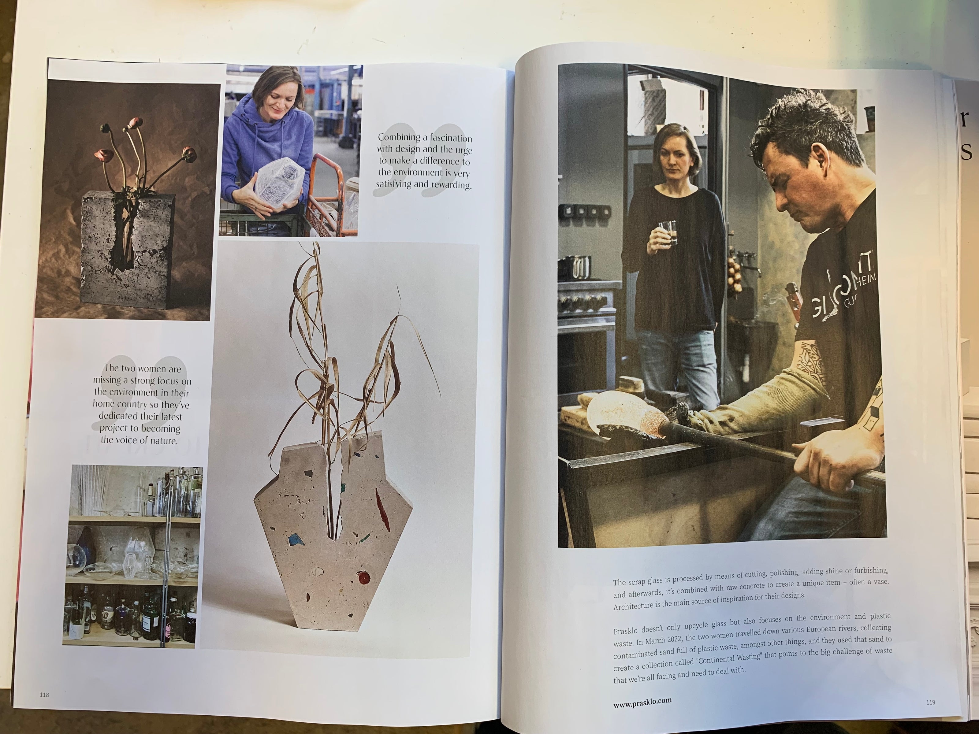 Umělecký design labelu PRASKLO tvoří umělecké duo Petra Švejdarová a Klára Vaculíková, které svou značku na české scéně buduje od roku 2014. PRASKLO vyrábí unikátní vázy a další předměty z odpadního skla a betonu (cementu). Namísto limitovaných edic je každá váza PRASKLO originál s vlastním příběhem, vyrobený vždy jen jednou. Výtvory Petry a Kláry vyrůstají z fascinace kamenem jako elementárním přírodním materiálem, včetně jeho struktury a různých podob, které může nabývat.