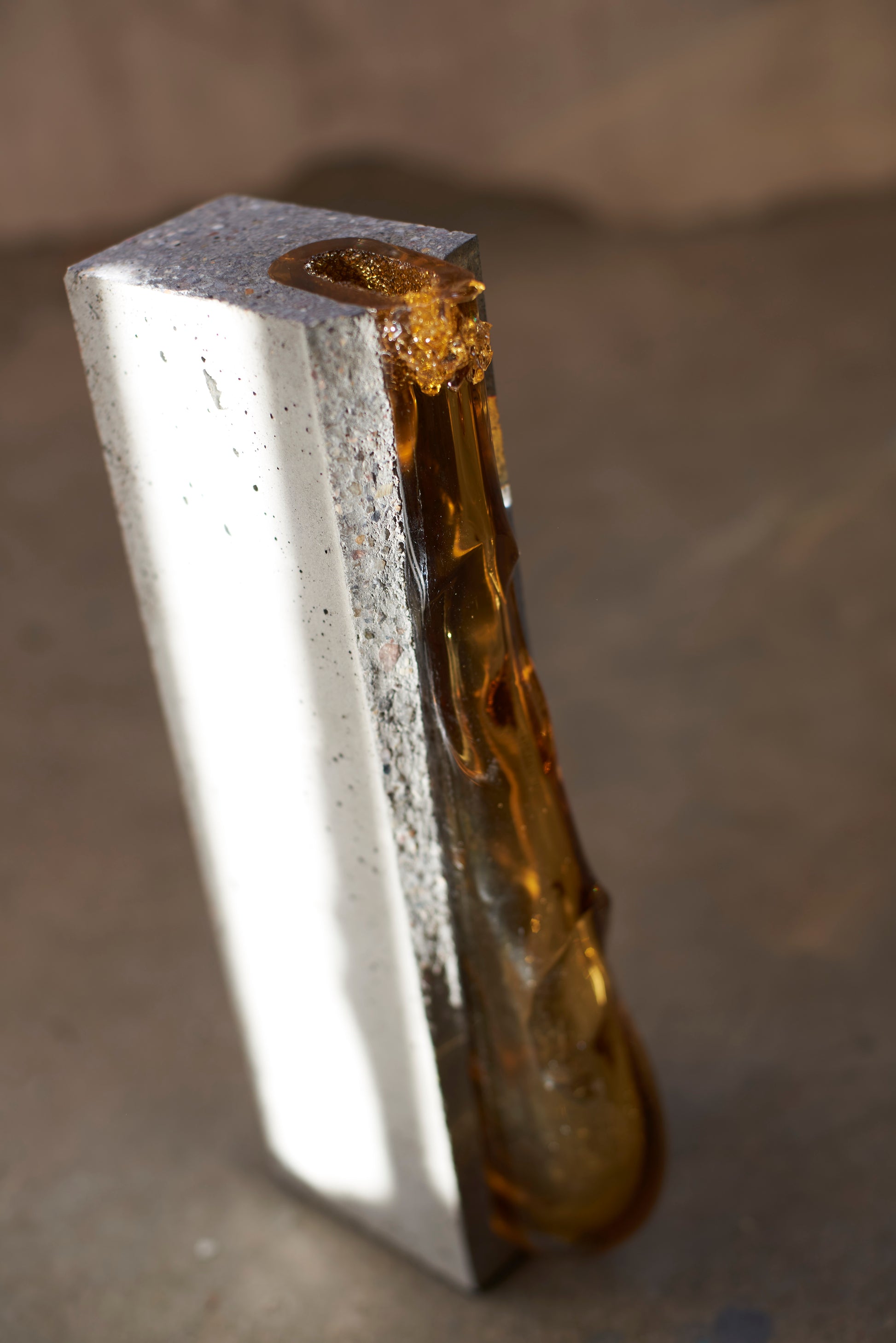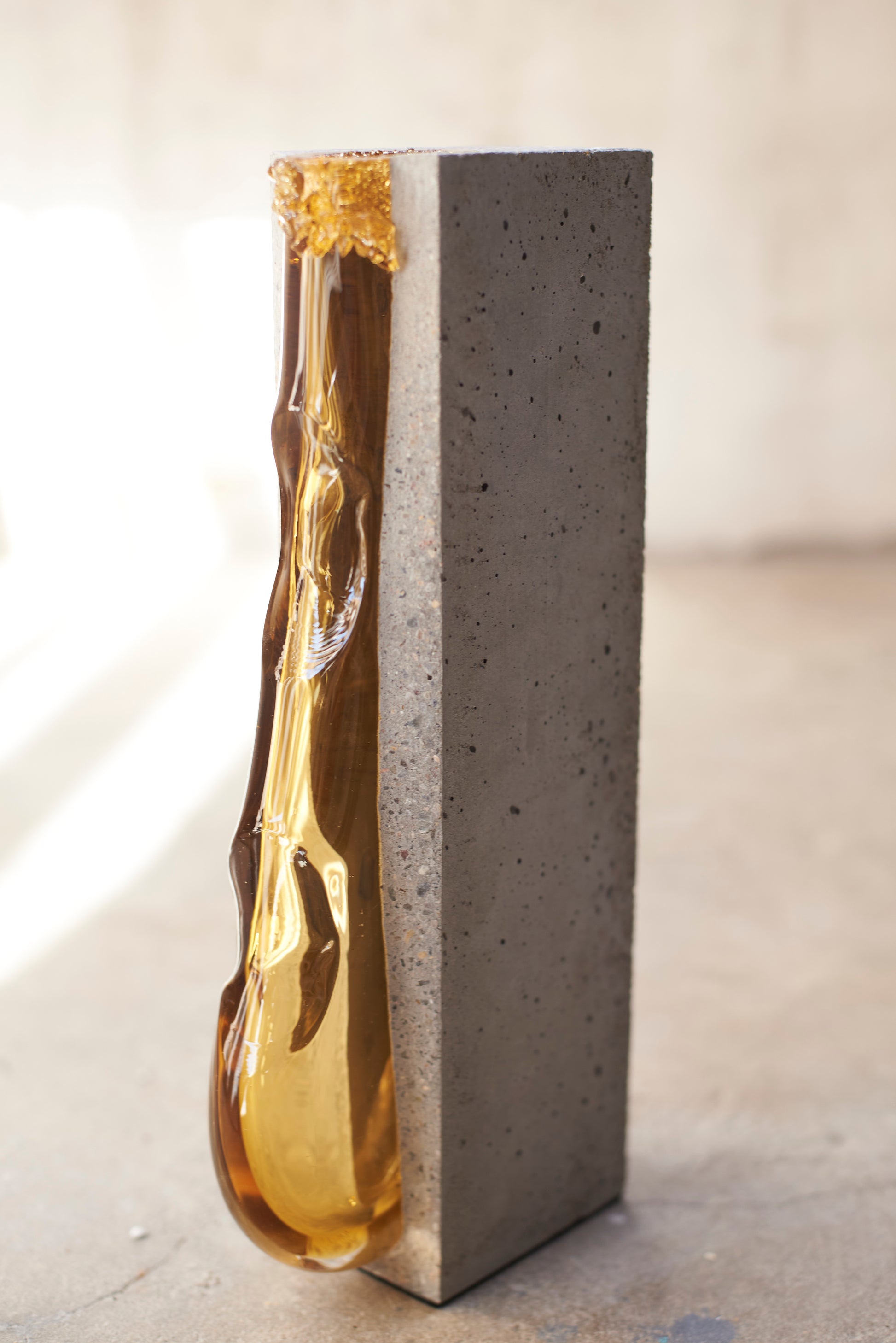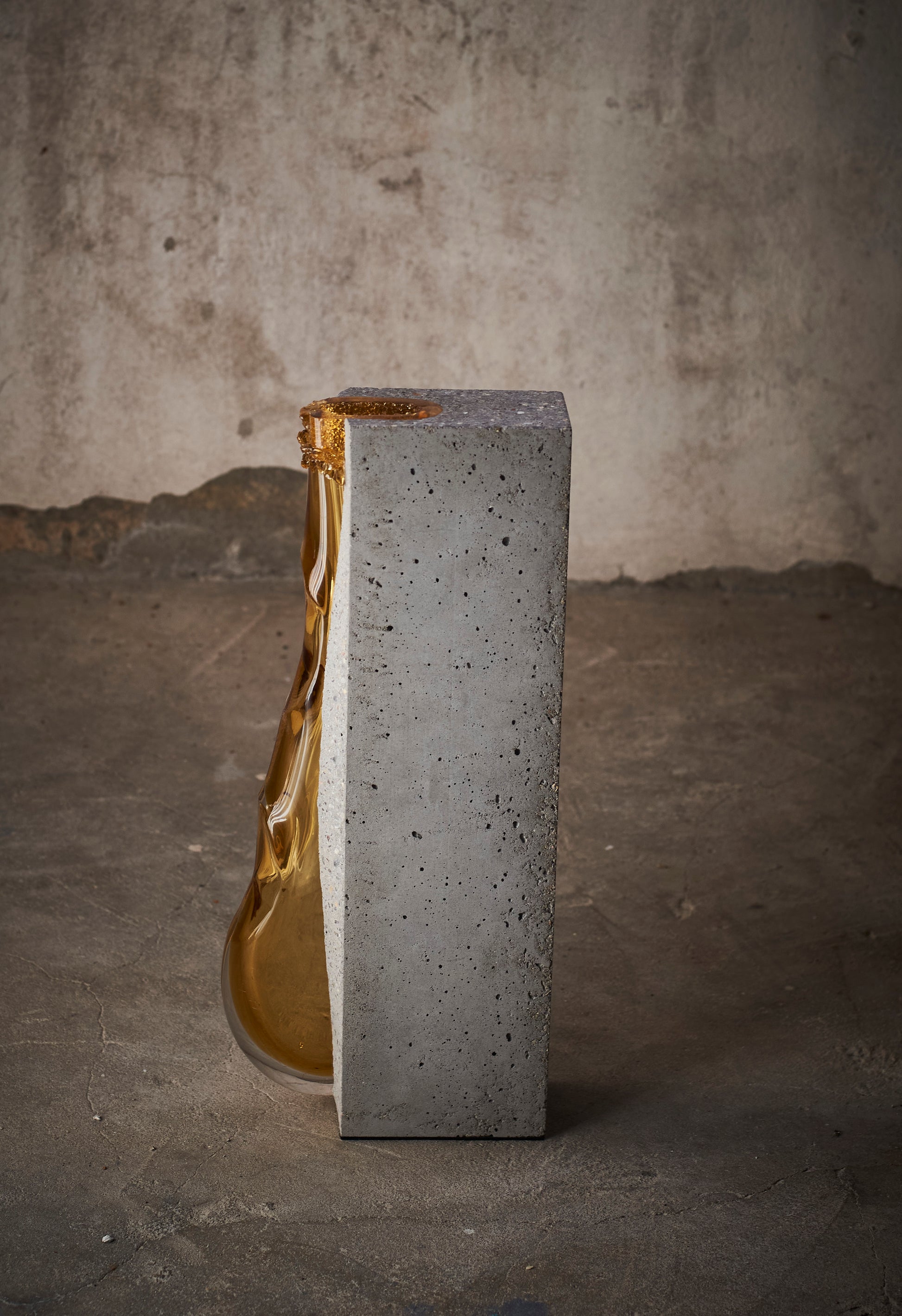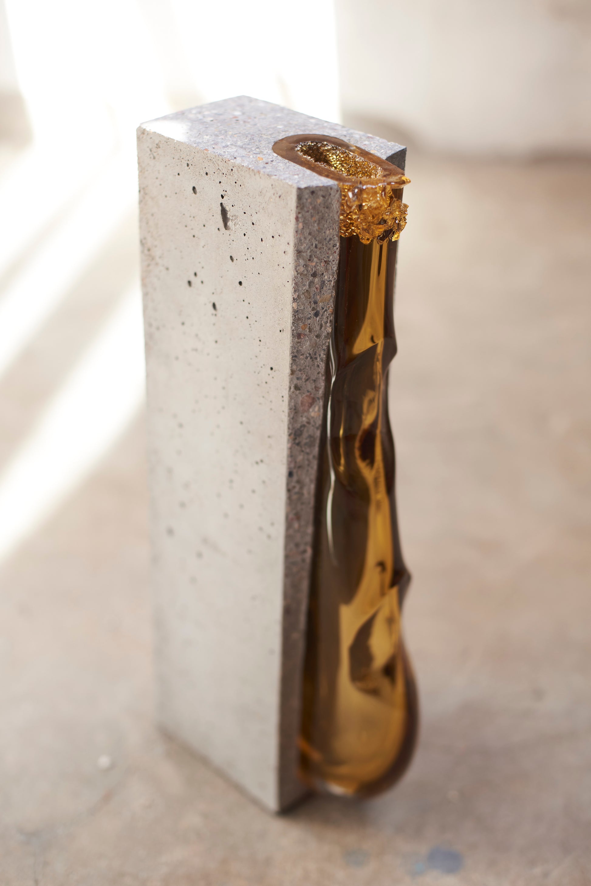 A vase created from up-cycled amber glass material and raw cement. Can be filled with water with no leaks. Solitary piece that looks wonderful in interior or exterior. Single hand made unique art vase. This vase weights 4kg.