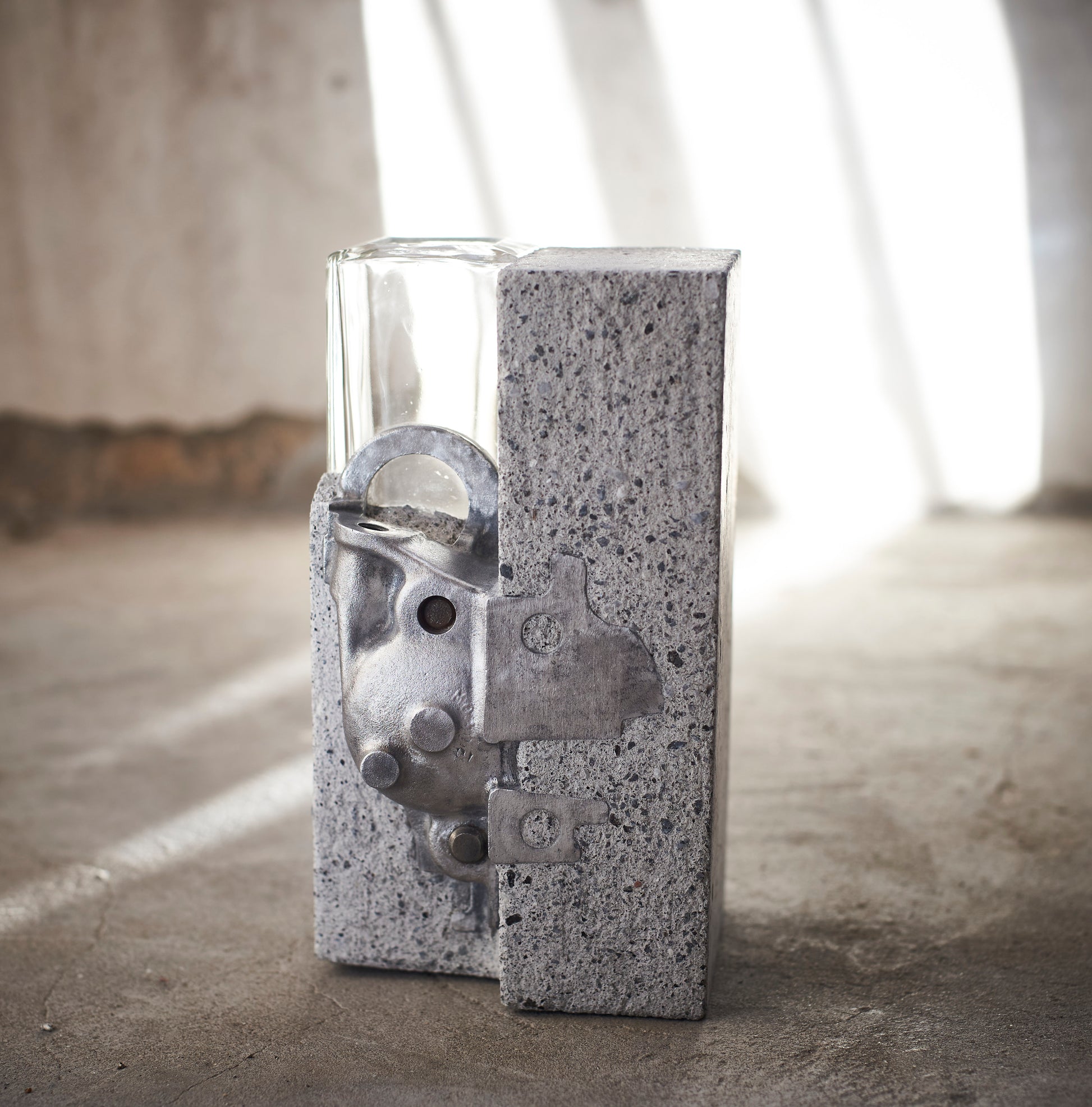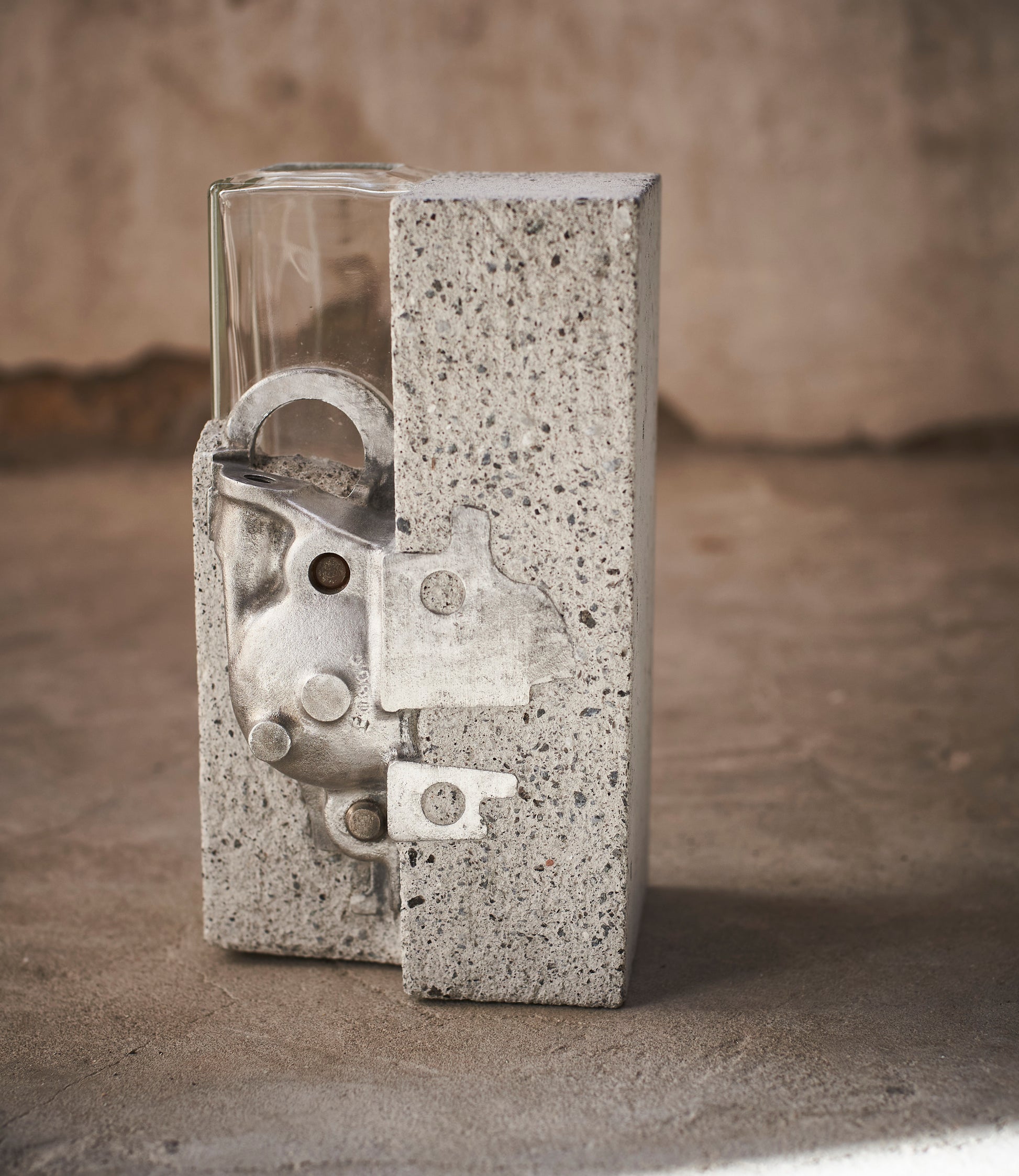A vase created from up-cycled glass and metal material and raw cement. Metal is part of Citroën Duck car engine. Can be filled with water with no leaks. Solitary piece that looks wonderful in interior or exterior. Single hand made unique art vase. This vase weights 3kg.