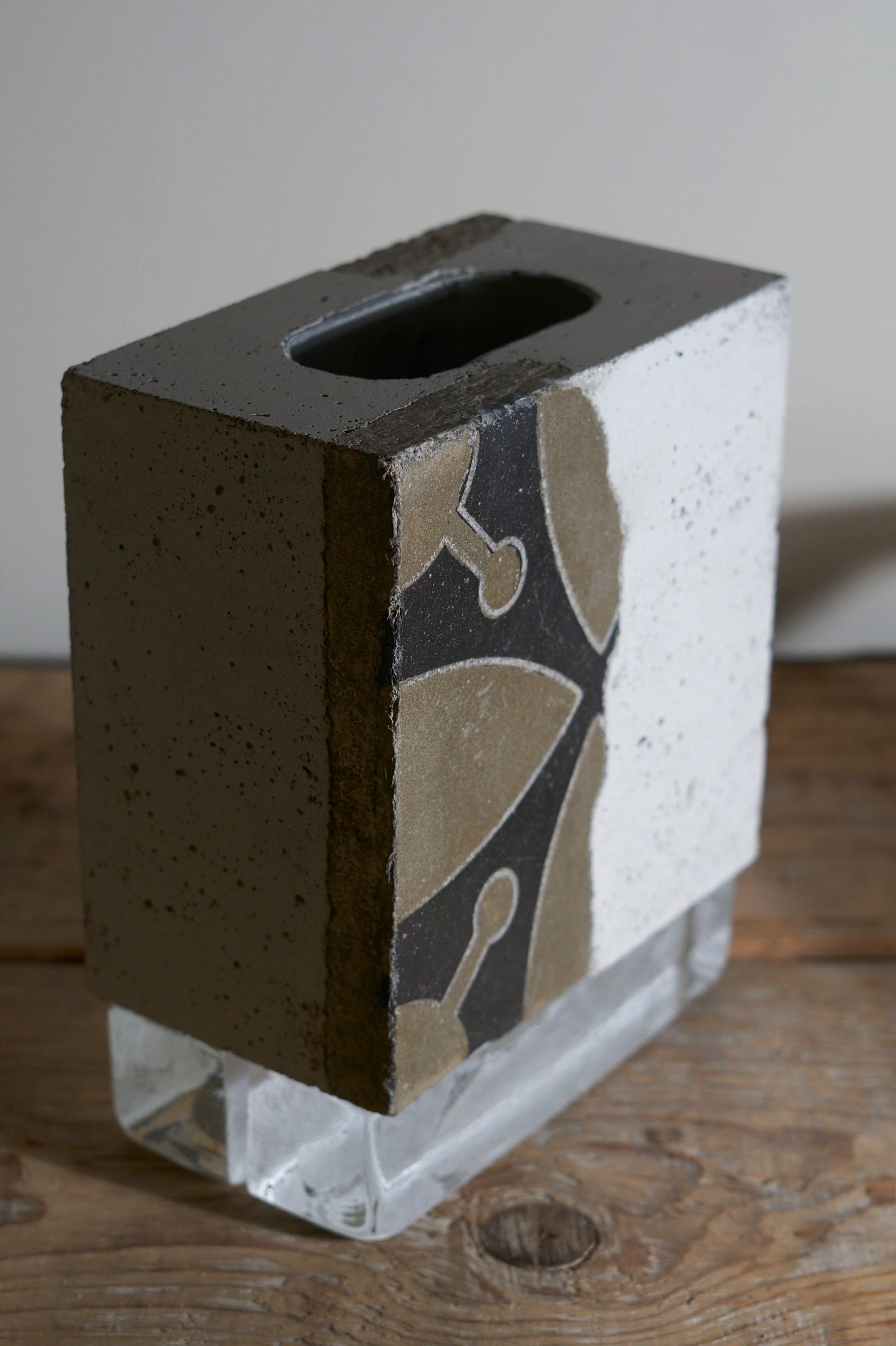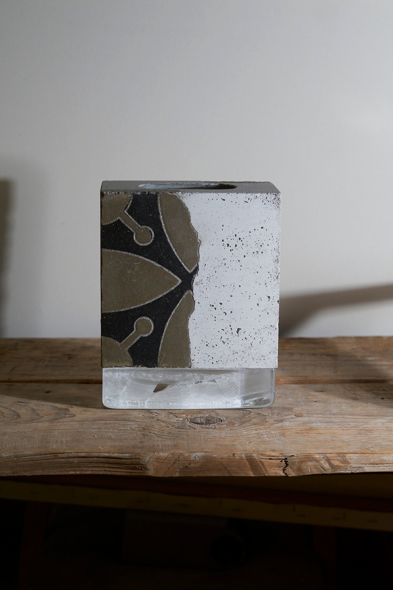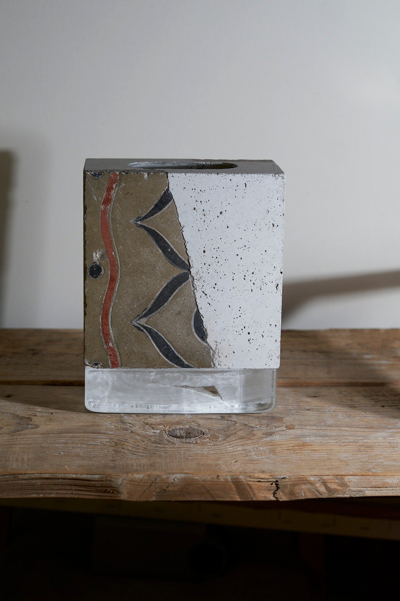 A vase created from up-cycled glass material, historical tiles, glass and raw cement. The tiles come from waste from reconstruction work on a historical building in the centre of old town Litomysl, Czech Republic. Can be filled with water with no leaks. Solitary piece that looks wonderful in interior or exterior. Single hand made unique art vase. This vase weights 7kg.