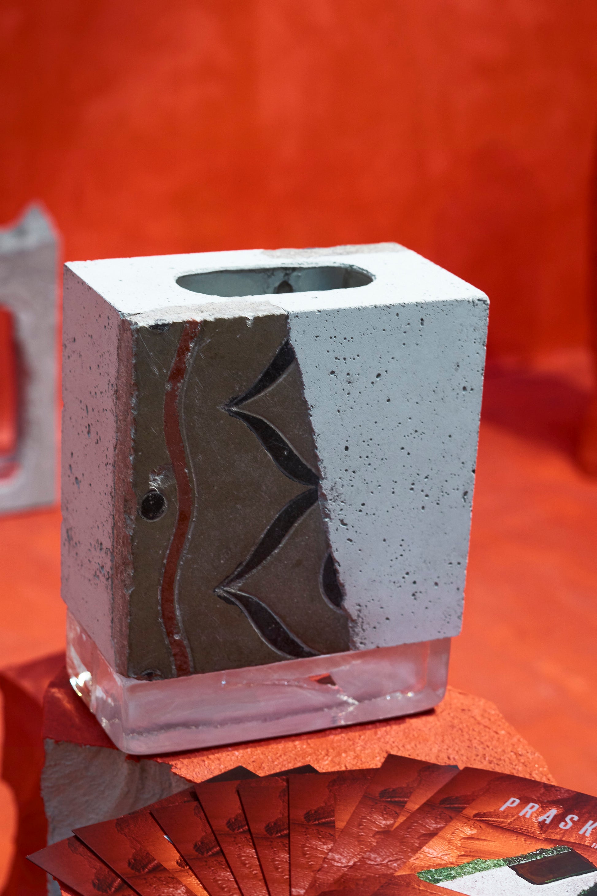 Prasklo is a brand of art vases by Prague female duo Petra Svejdarova and Klara vaculikova. Despite Prasklo has been collecting many positive responses from curators all over the world, it is not a commercial project. Prasklo sticks to artistic hand production of individual objects, not aiming for designing industrially produced goods. All vases are results of her fascination by the structure of glass which beauty can never be demeaned by disposing it; and its planting into a concrete pedestal.