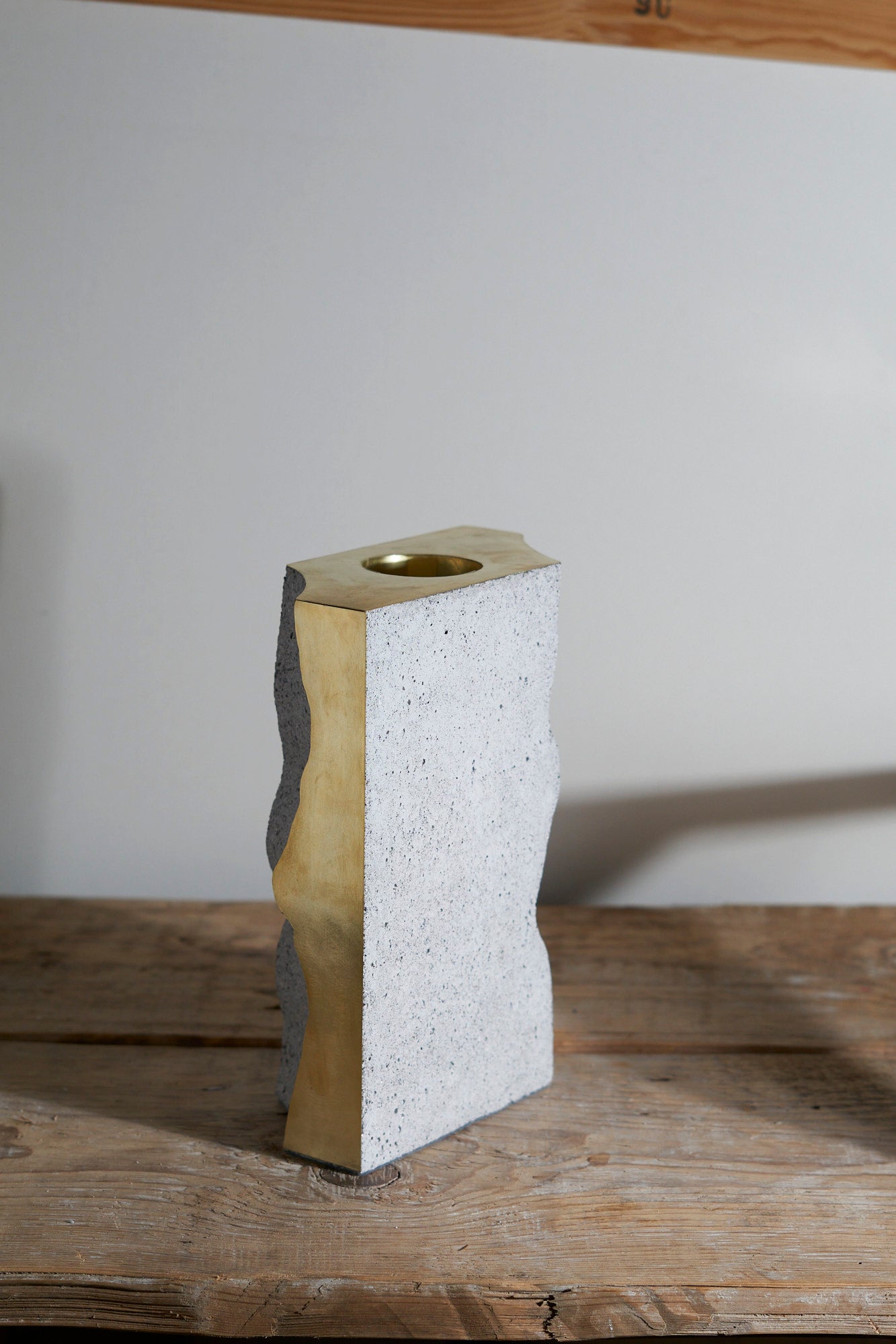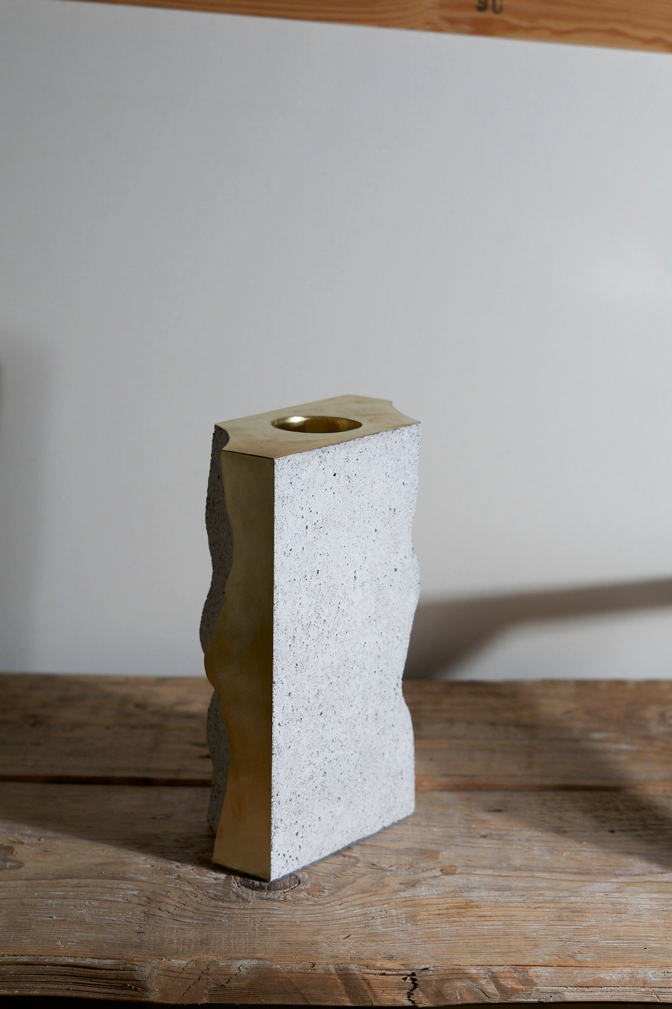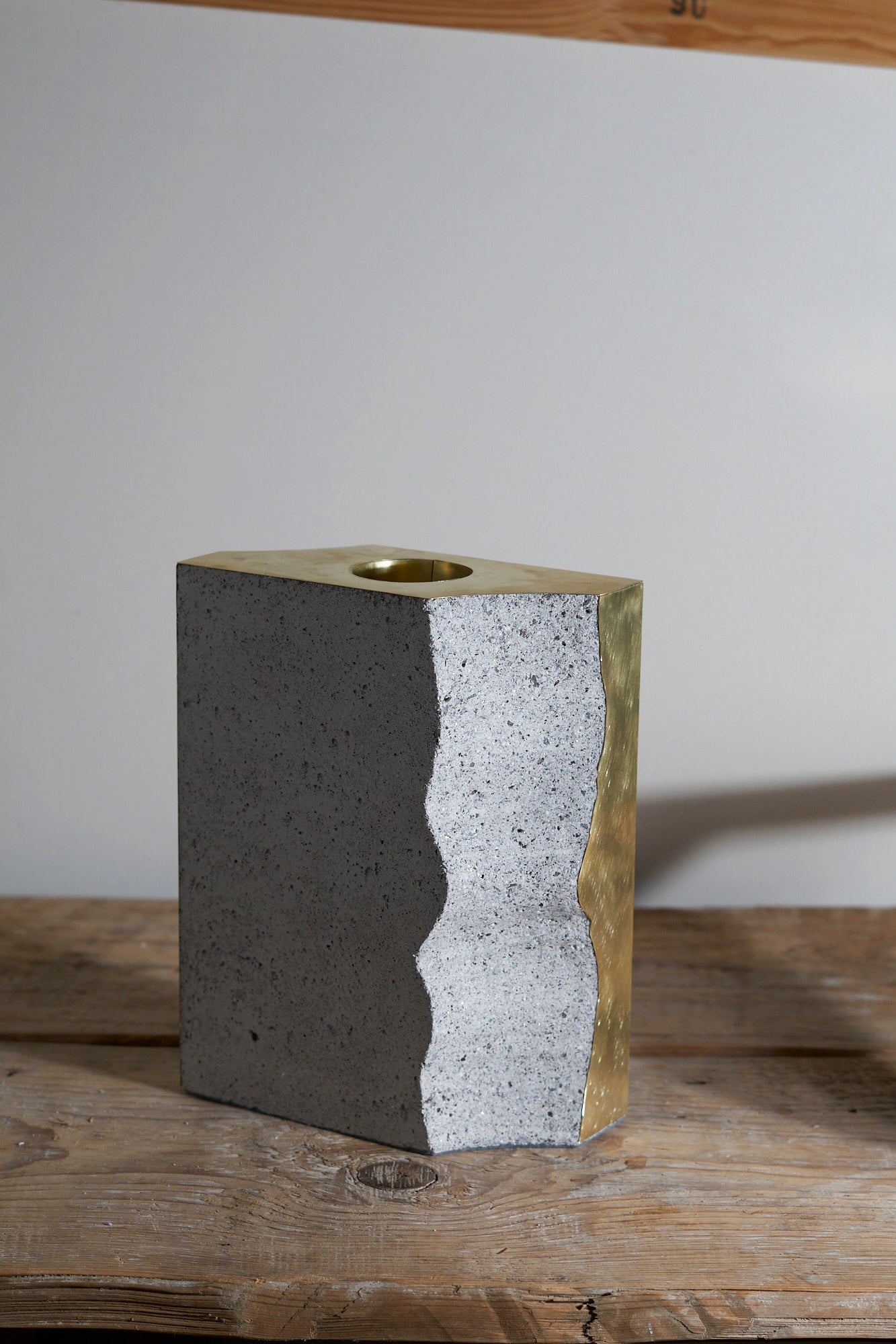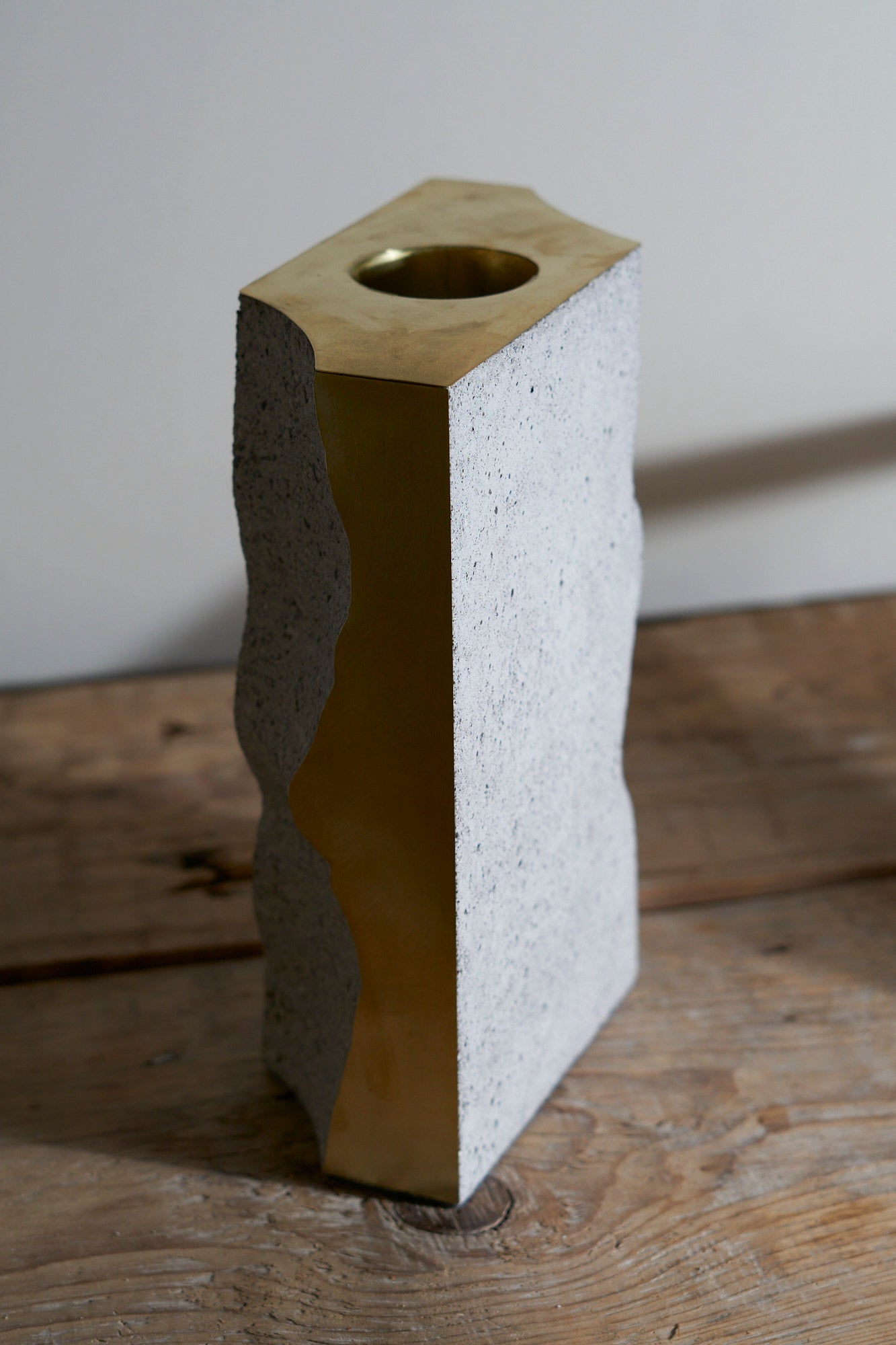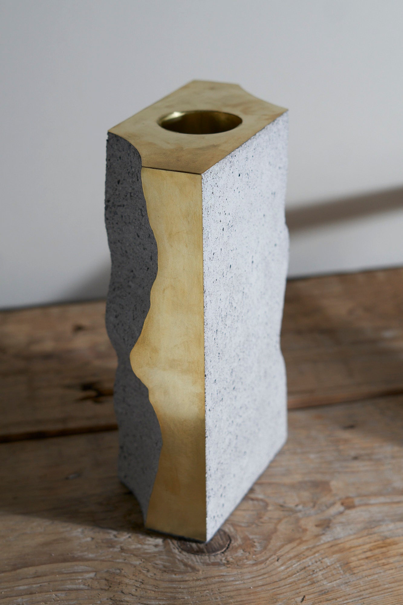 A vase created from up-cycled glass material, brass and raw cement. Can be filled with water with no leaks. Solitary piece that looks wonderful in interior or exterior. Single hand made unique art vase. This vase weights 6kg.