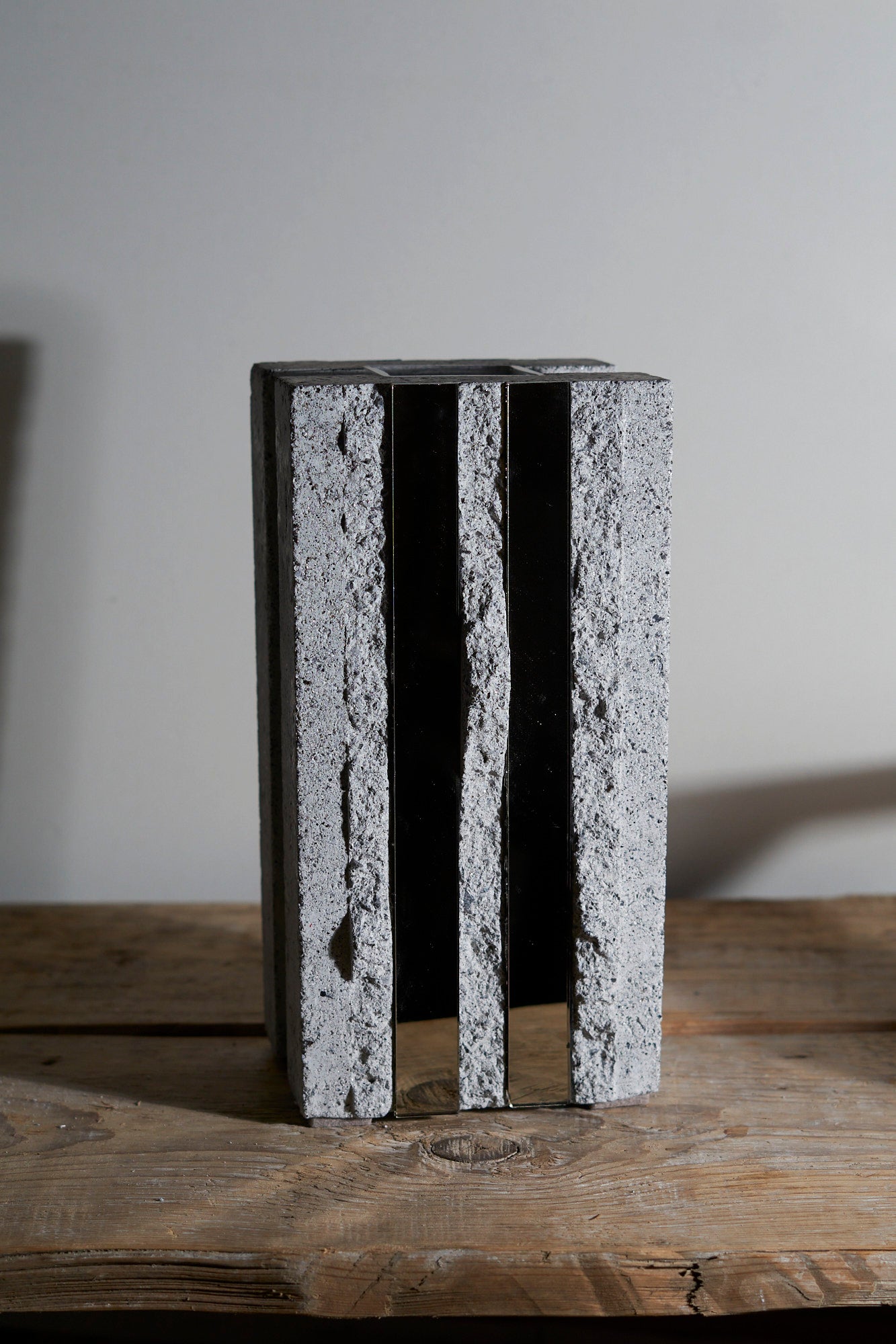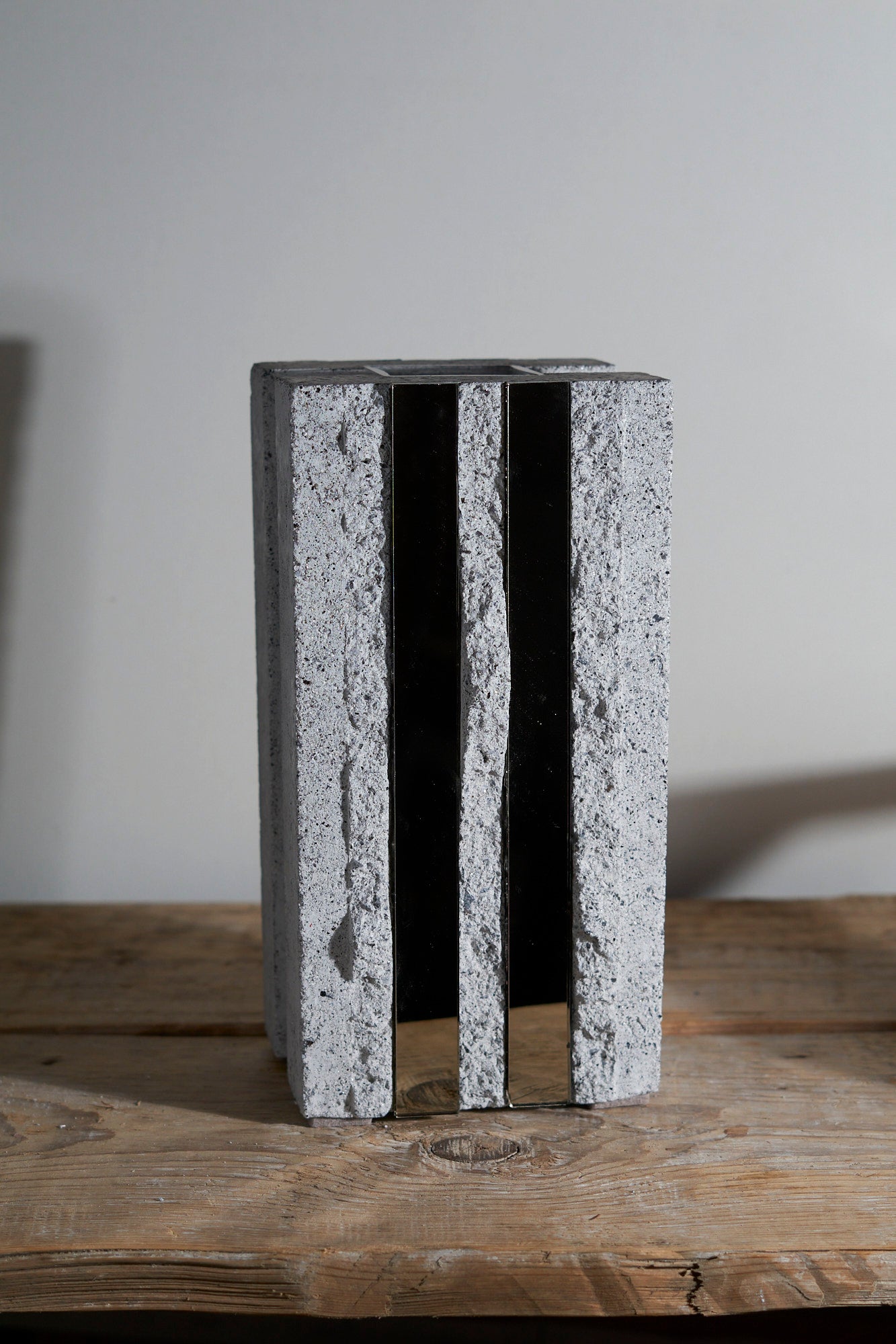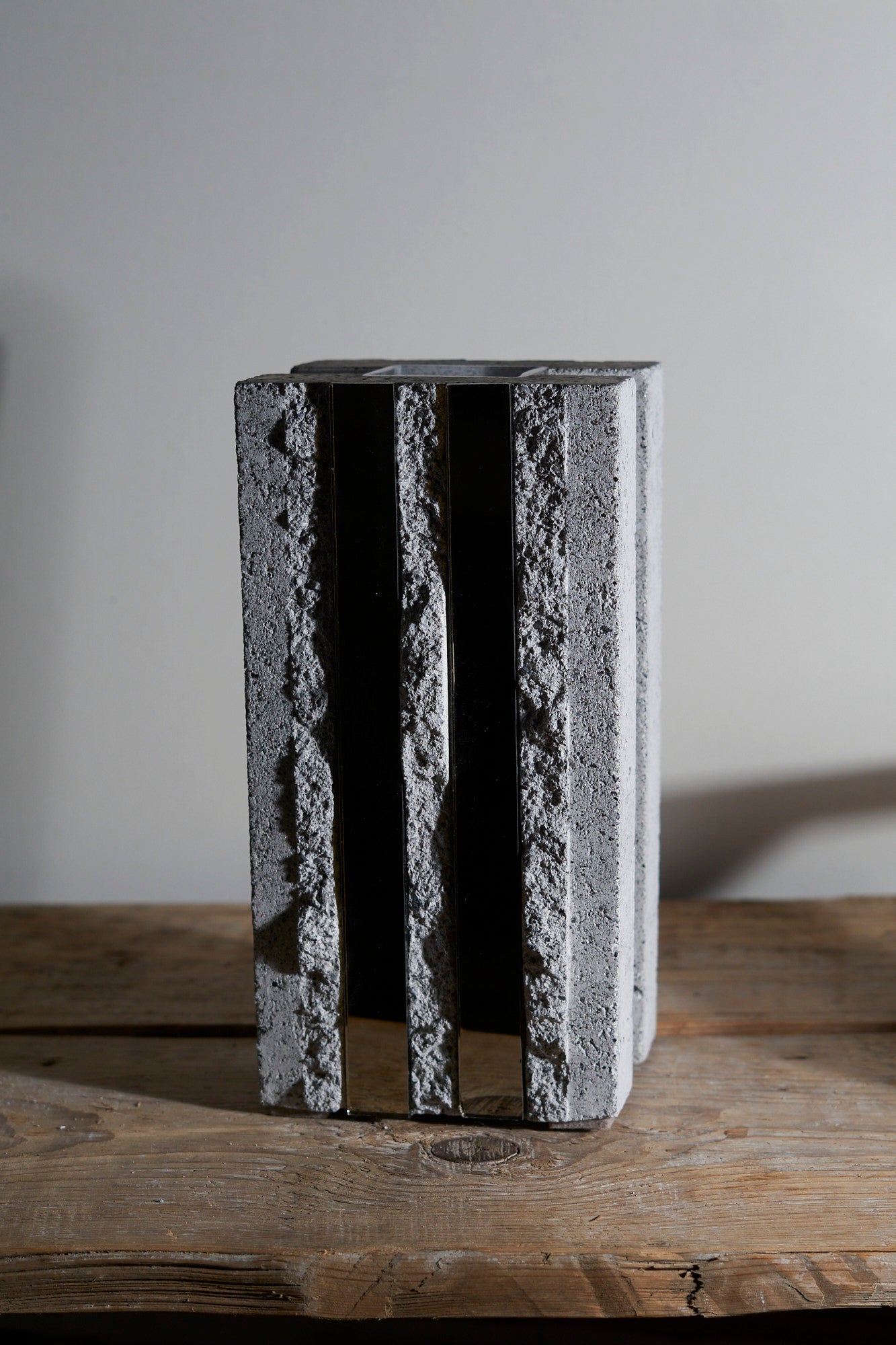 A vase created from up-cycled glass material, bronze mirror and raw cement. Can be filled with water with no leaks. Solitary piece that looks wonderful in interior or exterior. Single hand made unique art vase. This vase weights 7kg.