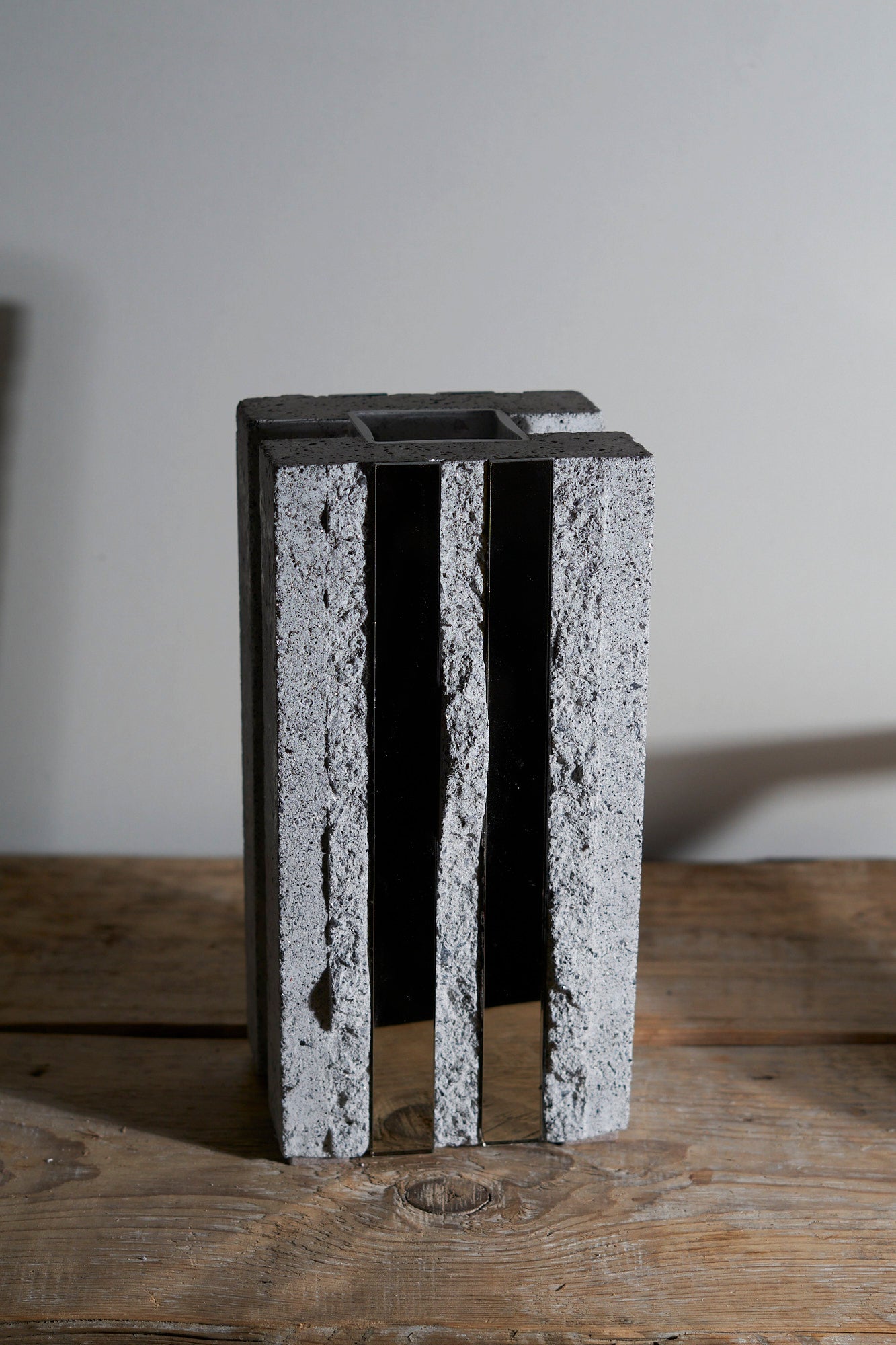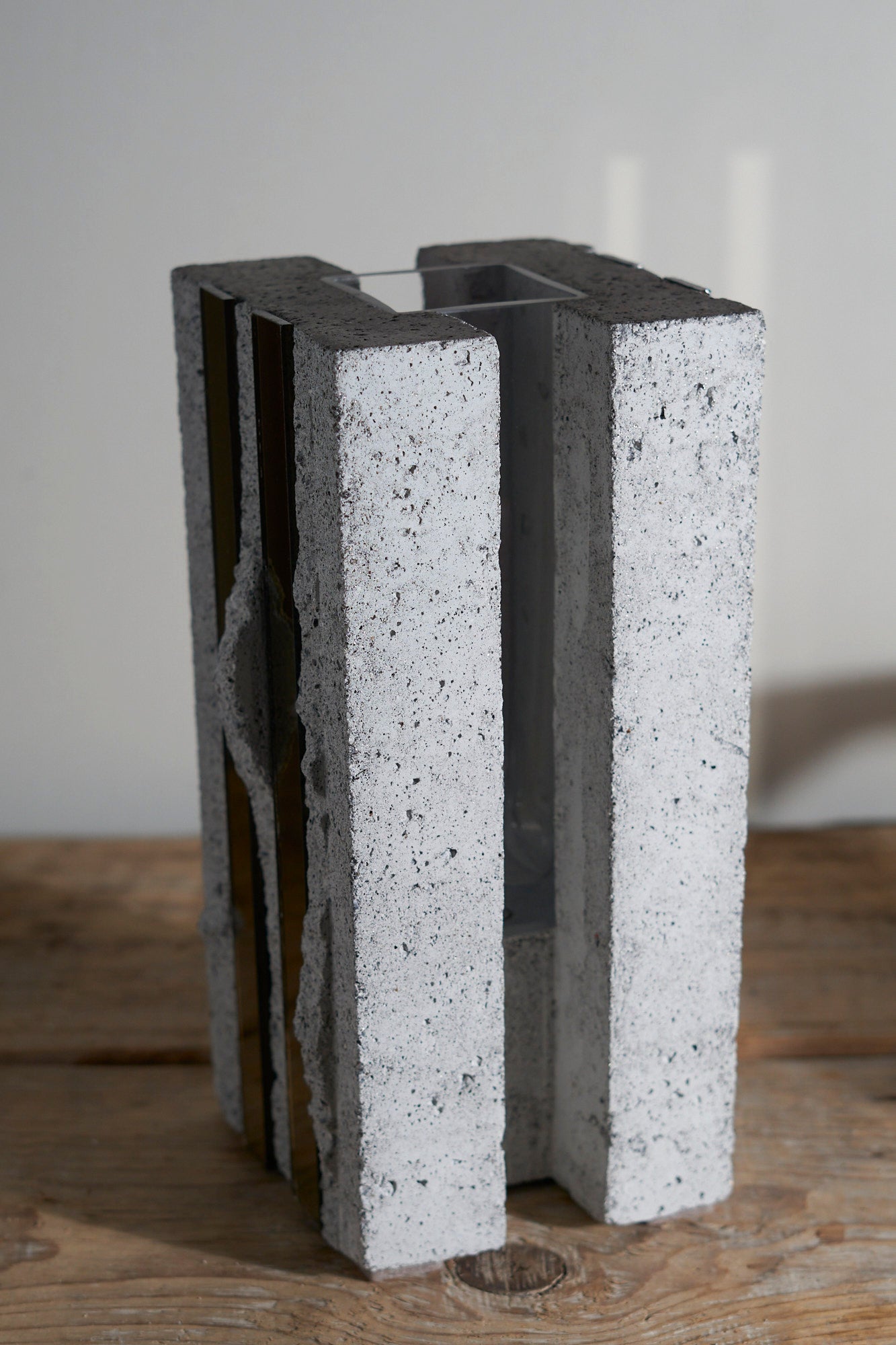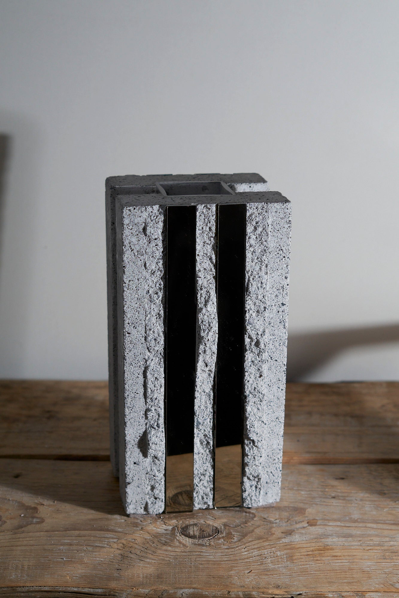 A vase created from up-cycled glass material, bronze mirror and raw cement. Can be filled with water with no leaks. Solitary piece that looks wonderful in interior or exterior. Single hand made unique art vase. This vase weights 7kg.