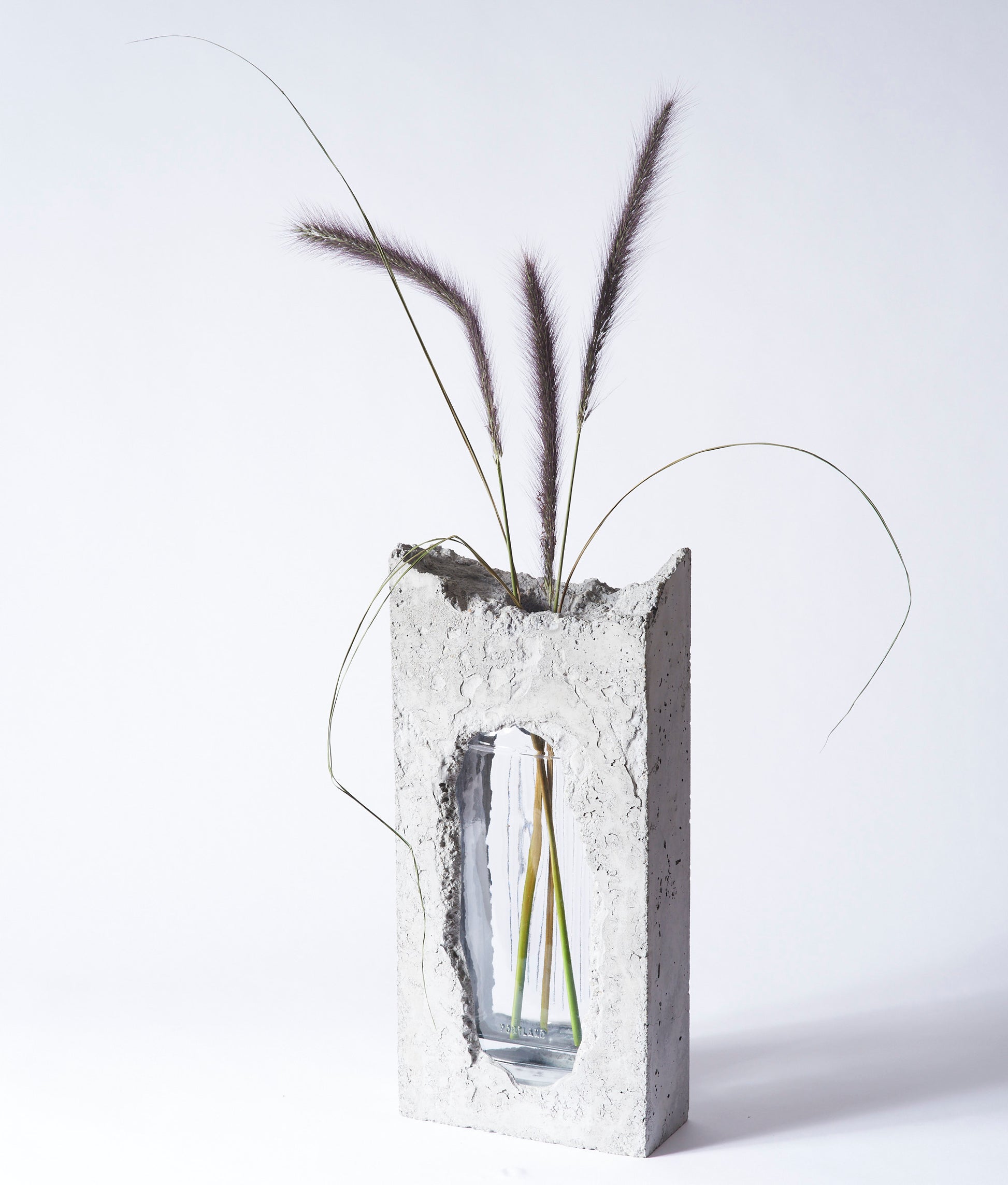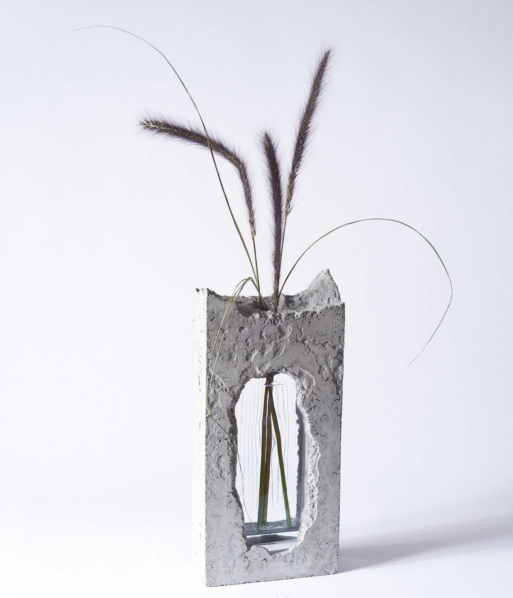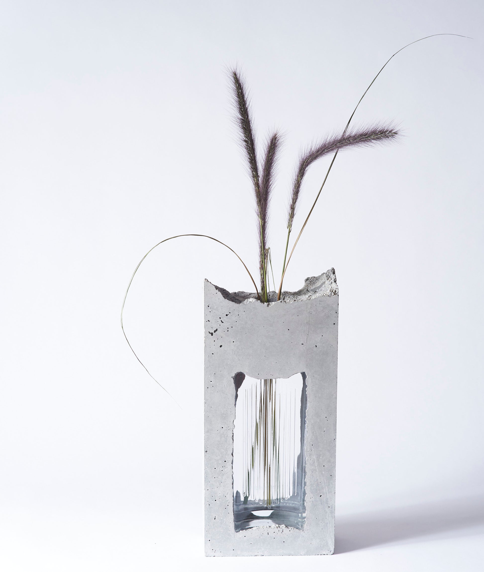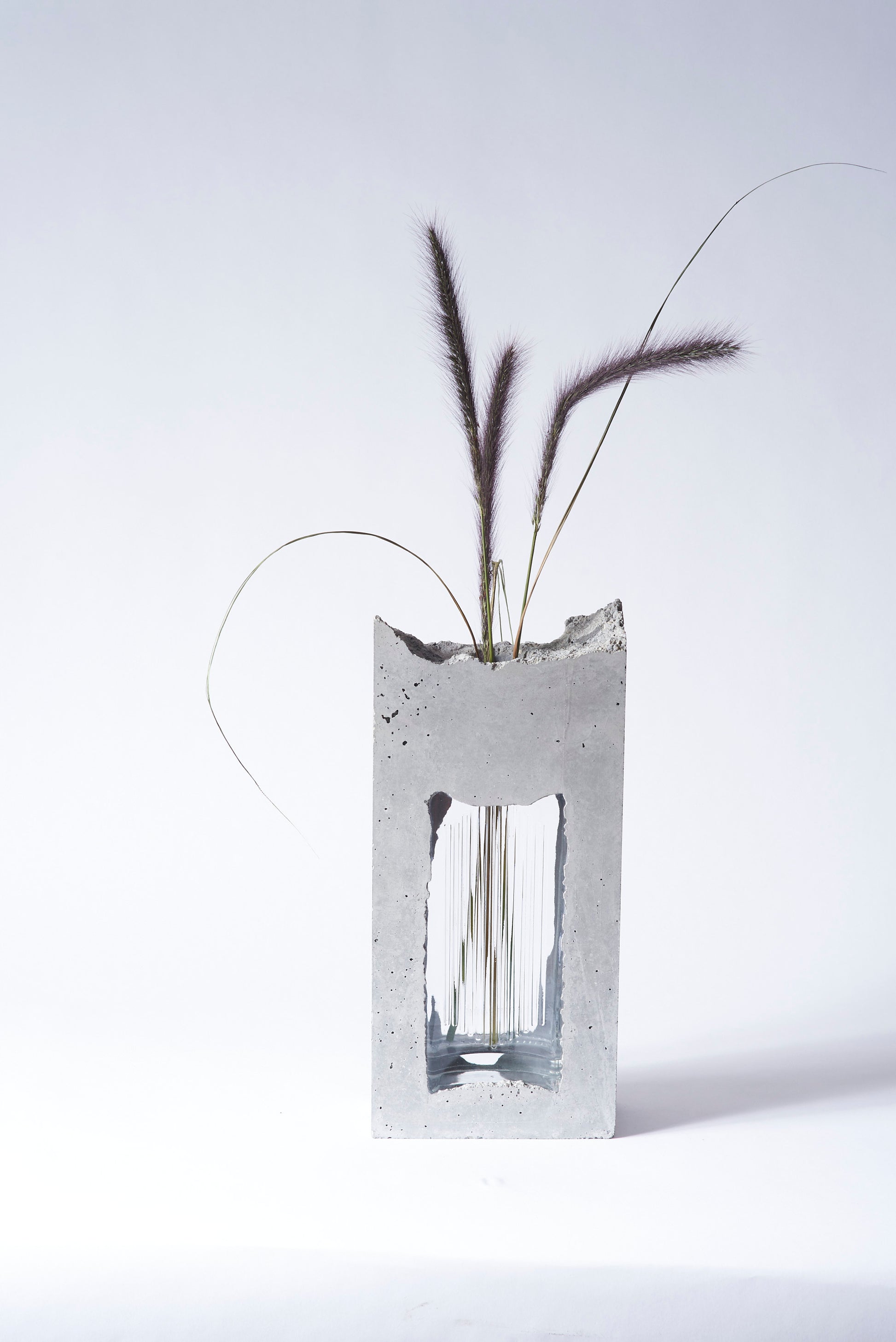 Eine größere Vase aus recyceltem Glasmaterial (eine Gin-Flasche, die ich in einer Prager Bar gekauft habe) und Rohbeton (Zement mit Stein). Die Vorderseite hat eine glatte Betonwand mit nur dezenten Hohlräumen und gestreiftem Glas, um von Menschen geschaffene Ordnung und Ruhe anzudeuten. Die Struktur der Rückseite ist eher wild und spiegelt die turbulente Energie und den Trotz der Erde wider. Die Oberseite der Vase ist völlig roh wie eine neu geformte Landschaft, die noch darauf wartet, von der Zeit geformt zu werden. Die Vase ist vom Autor mit ihren Initialen versehen, da sie ein individuelles Original ist.